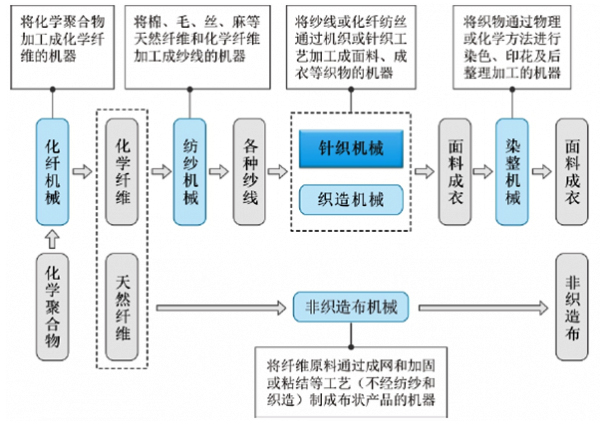 先來說下整個(gè)大行業(yè)——紡織機(jī)械設(shè)備。它主要包括了化纖機(jī)械、紡紗機(jī)械、針織機(jī)械、織造機(jī)械、非織造機(jī)械、染整機(jī)械和附屬裝置,各種紡織機(jī)械設(shè)備在紡織過程中所處的環(huán)節(jié)及其主要用途,我們做了詳細(xì)的圖表來表示,如下: